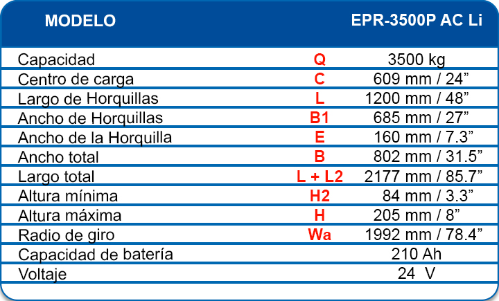 El EPR-3500P AC Li de MULTILIFT es un patín eléctrico hombre a bordo diseñado para maximizar la productividad durante largas jornadas de trabajo. Su capacidad es de 3500 kg y está equipado con una moderna batería de litio libre de mantenimiento.