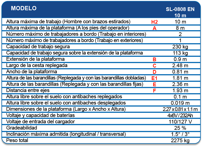Altura máxima de trabajo (Hombre con brazos estirados) 10 m